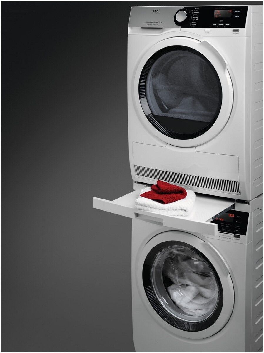 Platziere mit dem AEG Verbindungssatz für die Wasch-Trockensäule deinen Trockner platzsparend und sicher über deiner Waschmaschine. Die praktische, ausziehbare Arbeitsfläche erleichtert dir die Handhabung beim Sortieren deiner Wäsche.