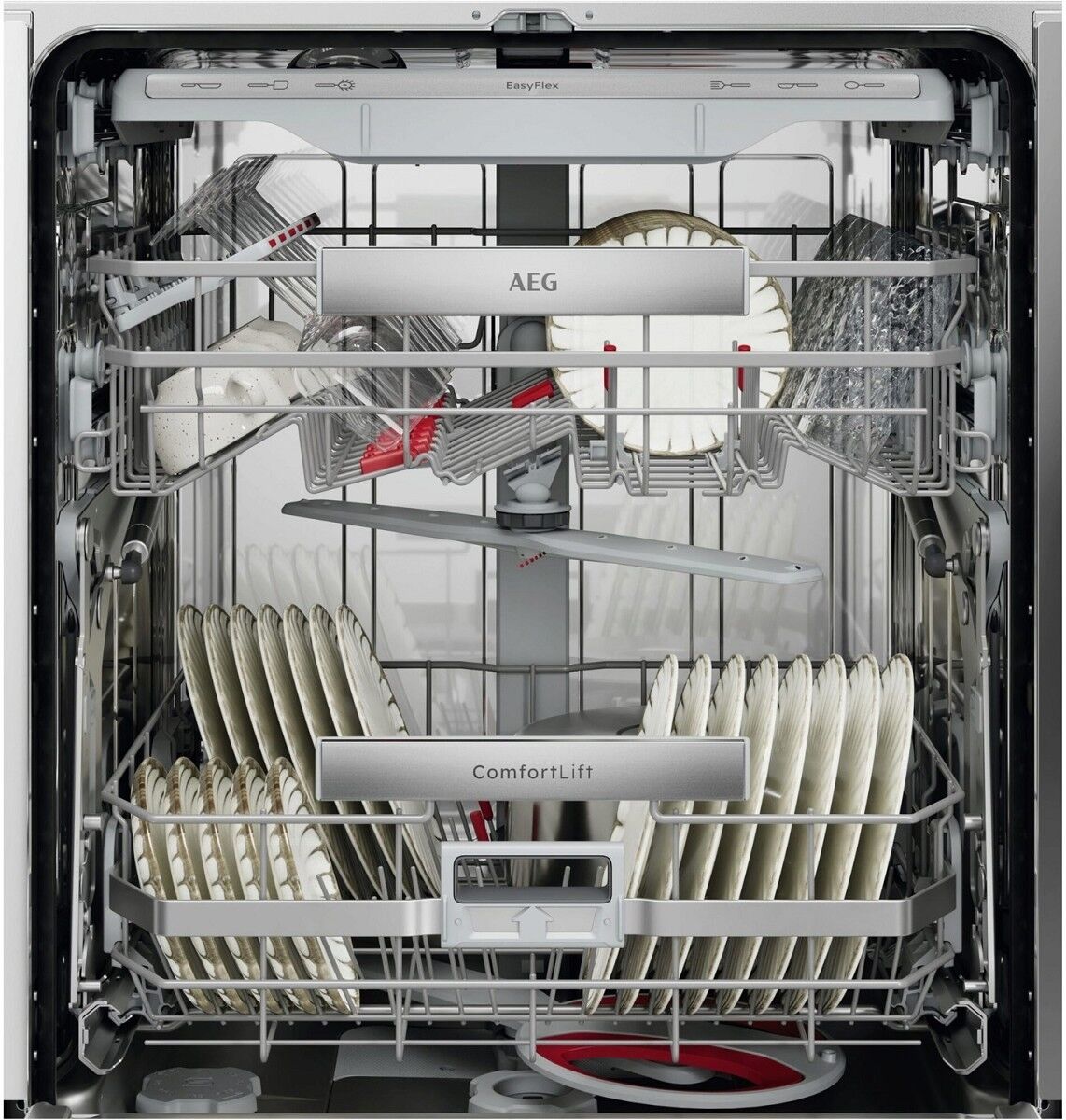 Die leichtläufigen EasyFlex Plus Körbe verfügen über drei Reihen klappbarer Zinken, um Platz für großes oder schwer zu verstauendes Geschirr zu schaffen. SoftGrips und SoftSpikes® fixieren Stielgläser und verhindern Kollisionen. Die Besteckschublade bietet Platz für Schneebesen und Suppenkellen.