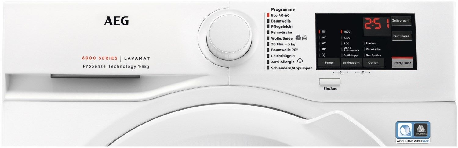 Die AEG Waschmaschinen der Serie 6000 passen mit der ProSense®-Technologie die Waschdauer und den Energieverbrauch immer an die Menge der Wäsche an – egal ob große oder kleine Beladungen. Dadurch wird Ihre Kleidung geschont, sowie Energie, Wasser und Zeit gespart.