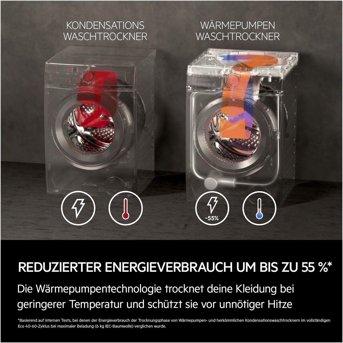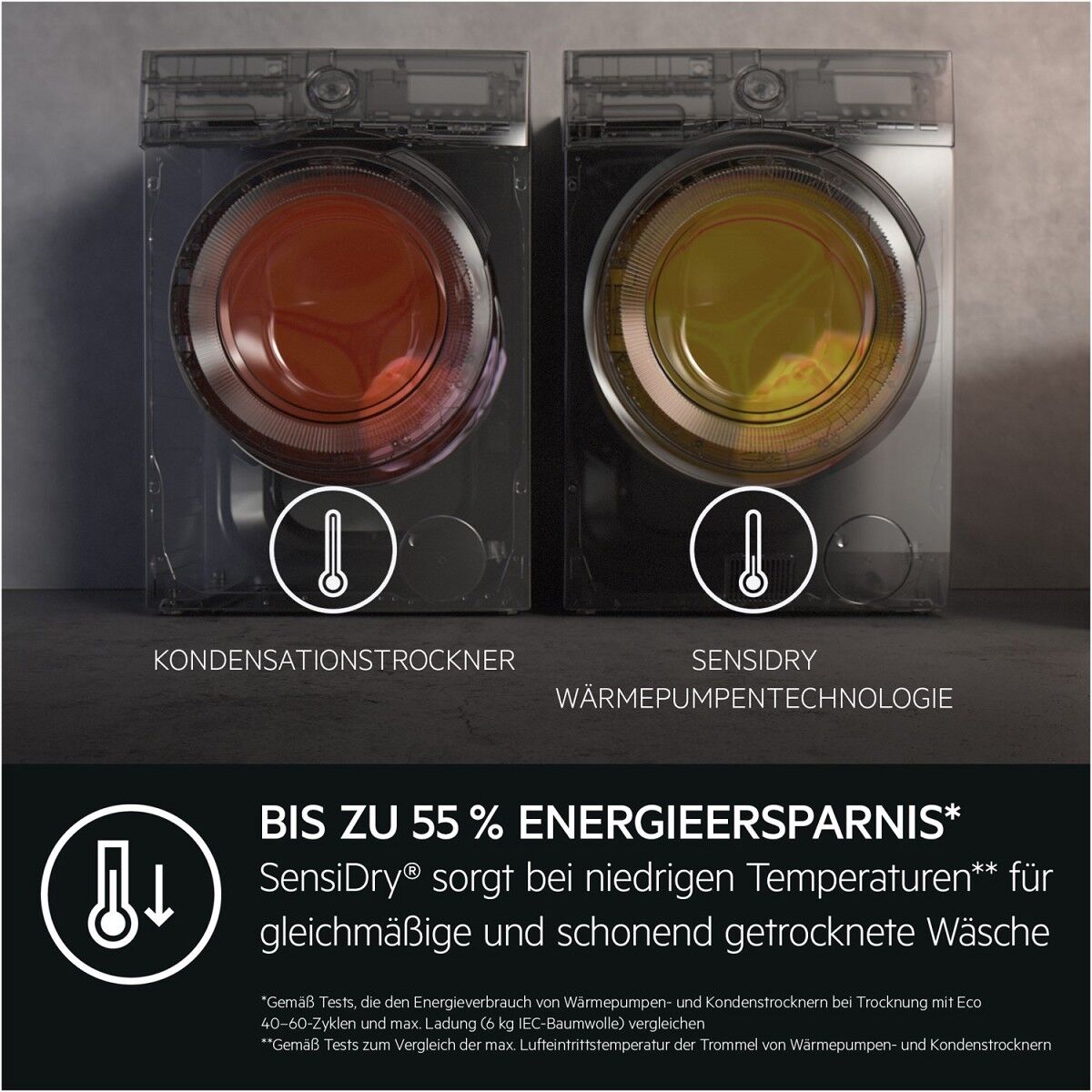 Die energiesparende SensiDry®-Wärmepumpentechnologie nutzt präzise Sensoren, die für gleichmäßige Trockenergebnisse sorgen - bei halber Temperatur*. Deine Textilien werden geschont und du sparst bis zu 55 %*** Energie. *Gemäß interner Tests zum Vergleich der max. Lufteintrittstemperatur der Trommel von Wärmepumpen- und Kondenswaschtrocknern. *** Gemäß interner Tests, die den Energieverbrauch von Wärmepumpen- und Kondenstrocknern bei Trocknung mit 40–60-Zyklen und max. Ladung (6 kg IEC-Baumwolle) vergleichen.