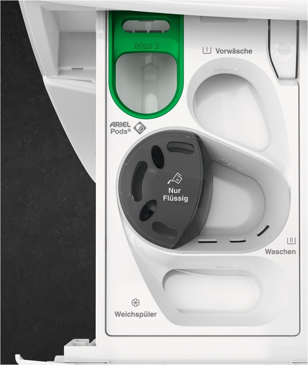UniversalDose Schublade: Löst PODS®/CAPS 60 % schneller auf*Die UniversalDose- Schublade löst durch die fortschrittliche Wasserwirbel-Technologie Waschmittel-PODS® und Caps 60 % schneller auf im Vergleich zur Trommelbeigabe. Das steigert die Reinigungsleistung und Fleckentfernung bei Kurz- und Niedrigtemperatur-Programmen.**Interner Test mit einem einstündigen Baumwoll- Programm bei 30 °C, PODS®/Caps in der UniversalDose Schublade verglichen mit PODS®/Caps in der Trommel