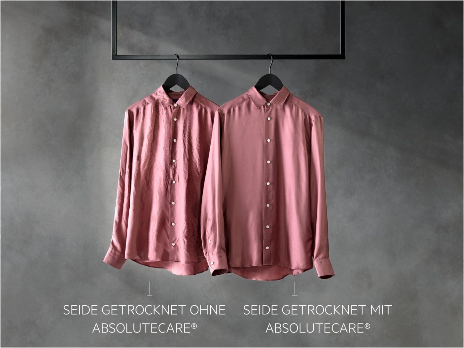 AbsoluteCare®: Garantiert kein Einlaufen - auch bei Wolle und Seide*AbsoluteCare® nutzt die Wärmepumpentechnologie zusammen mit präzise gesteuerten Trommelbewegungen, um selbst deine empfindlichsten Kleidungsstücke schonend zu trocknen. Wolle läuft nicht ein, Seide bleibt in Form und sogar die Imprägnierung deiner Outdoor-Bekleidung wird wieder hergestellt. AbsoluteCare®: Garantiert kein Einlaufen - auch bei Wolle und Seide**Vergleichbar mit liegend getrockneter Wolle.