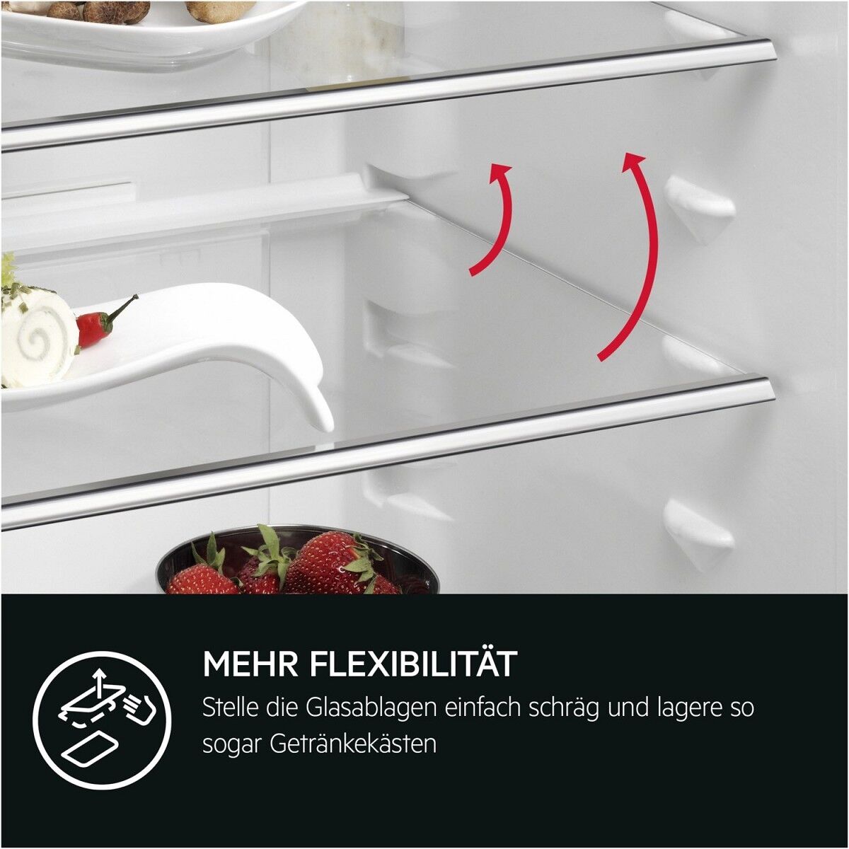 OptiSpace ermöglicht dir eine flexible Nutzung des Kühlraums. Einfach die Glasablagen herausnehmen und deinen Bedürfnissen entsprechend anordnen – beispielsweise für die Lagerung von hohen Gegenständen wie Torten oder großen Töpfen. Zudem erleichtert dir die Entnahmen der Ablagen die Reinigung des Innenraums.