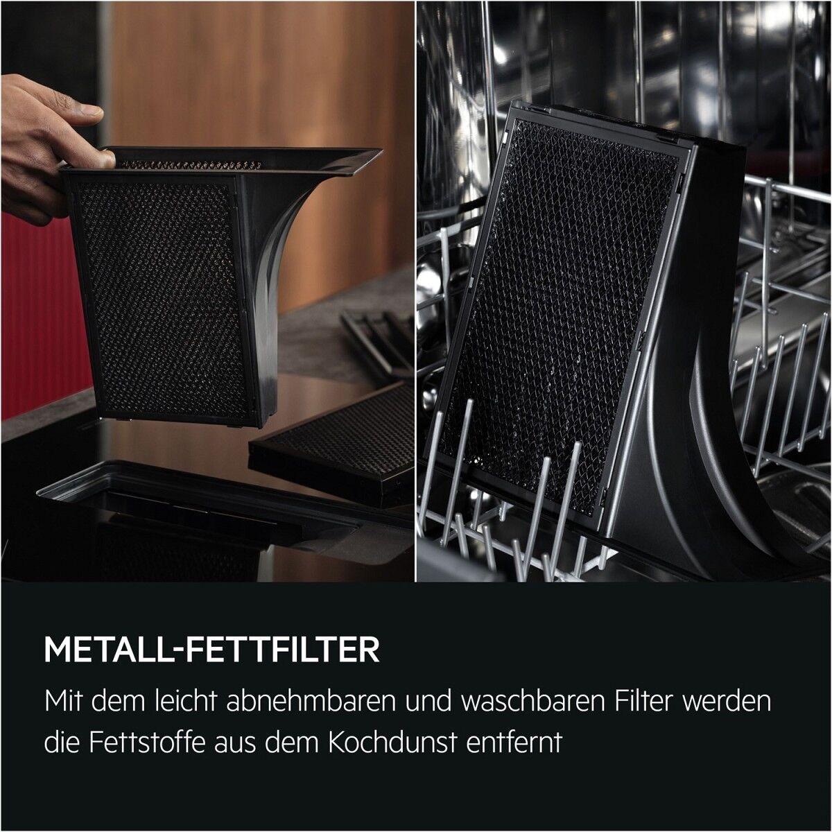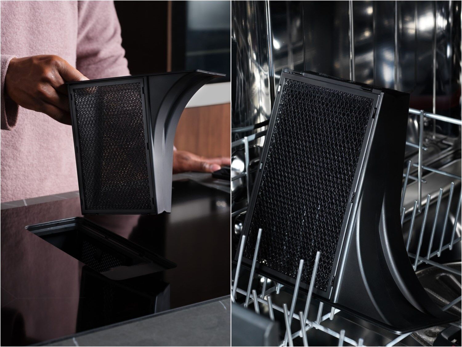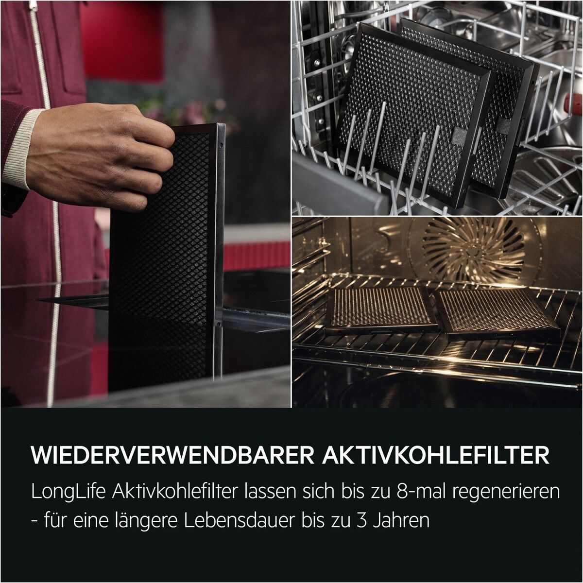 LongLife Aktivkohlefilter: Komfortable Reinigung, mehrfache WiederverwendungDer Aktivkohlefilter kann bis zu 8-mal im Ofen regeneriert werden, was einer Lebensdauer von etwa 3 Jahren entspricht. Fett- und Aktivkohlefilter können einfach in der Spülmaschine gereinigt werden. So bleibt deine Küchenluft angenehm frisch und der Dunstabzug arbeitet länger mit voller Leistung.