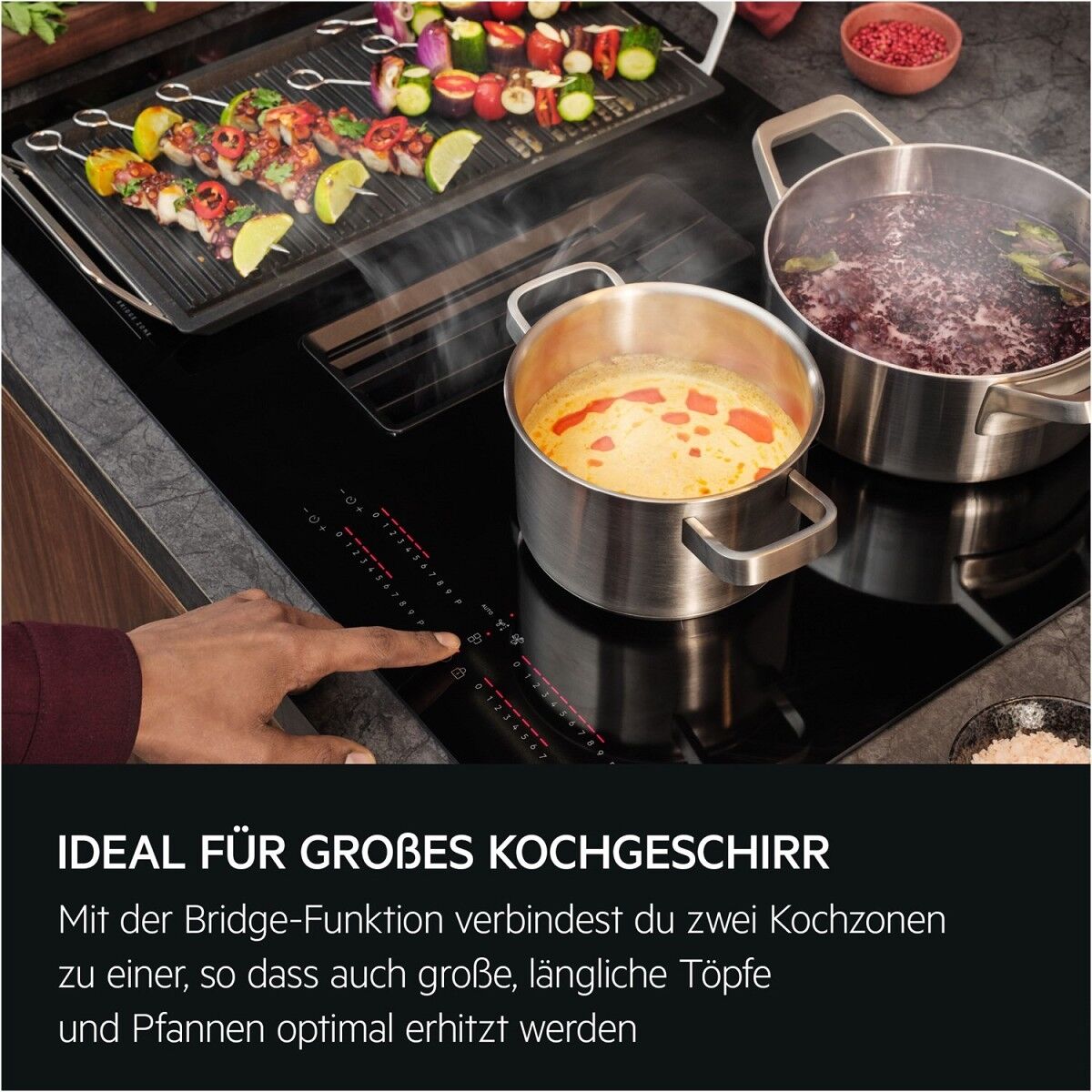 XTM Bridge: Für mehr Freiheit bei der KüchenplanungDie 6000 Bridge XTM Kochfelder haben einen leistungsstarken integrierten Dunstabzug und ermöglichen den Einbau in einen 60 cm Küchenschrank. Zudem bieten sie mit der Bridge-Funktion die Möglichkeit zwei Kochzonen zu einer großen zu verbinden, sodass auch großes Kochgeschirr optimal erhitzt wird.