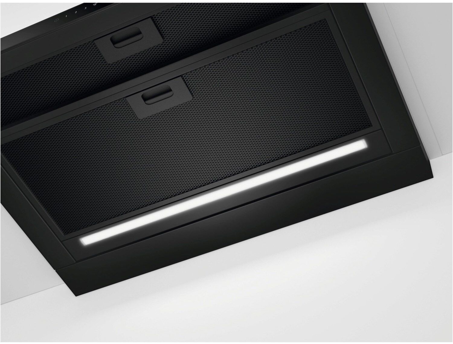 Design-Statement in stilvollem Mattschwarz: Die Dunstabzugshaube passt optisch perfekt zu SaphirMatt®- Induktionskochfeldern und fügt sich nahtlos in moderne Küchenwelten ein. Ihre matte, strukturierte Oberfläche ist nicht nur ein Blickfang, sondern auch pflegeleicht und fingerabdruckresistent.