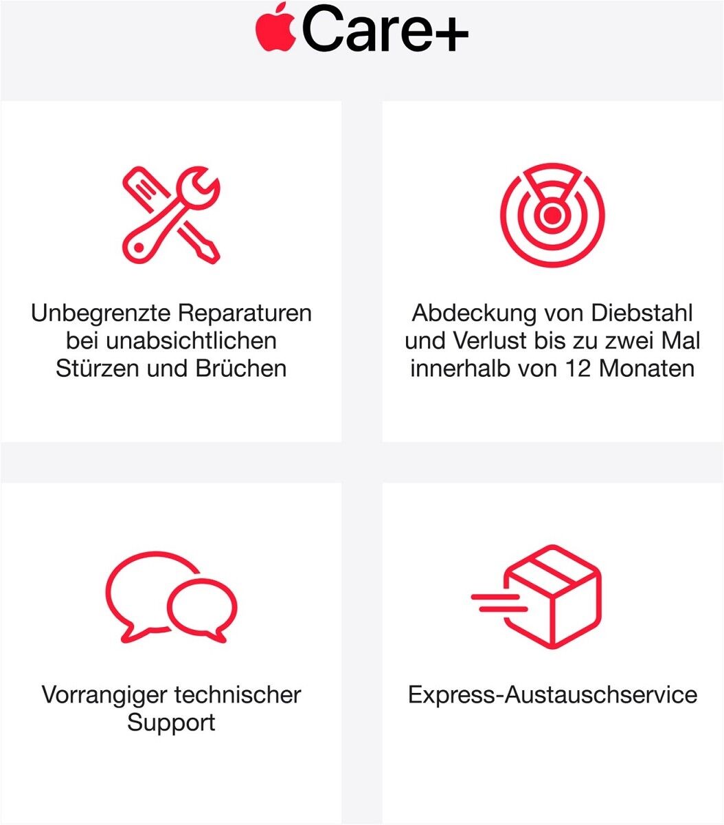 Für Apple Care+ gelten Vertragsbedingungen, einschließlich der Servicegebühren. Änderungen sind vorbehalten. Die Verfügbarkeit von Features und die Optionen können variieren. Weitere Infos unter https://www.apple.com/de/applecare/.