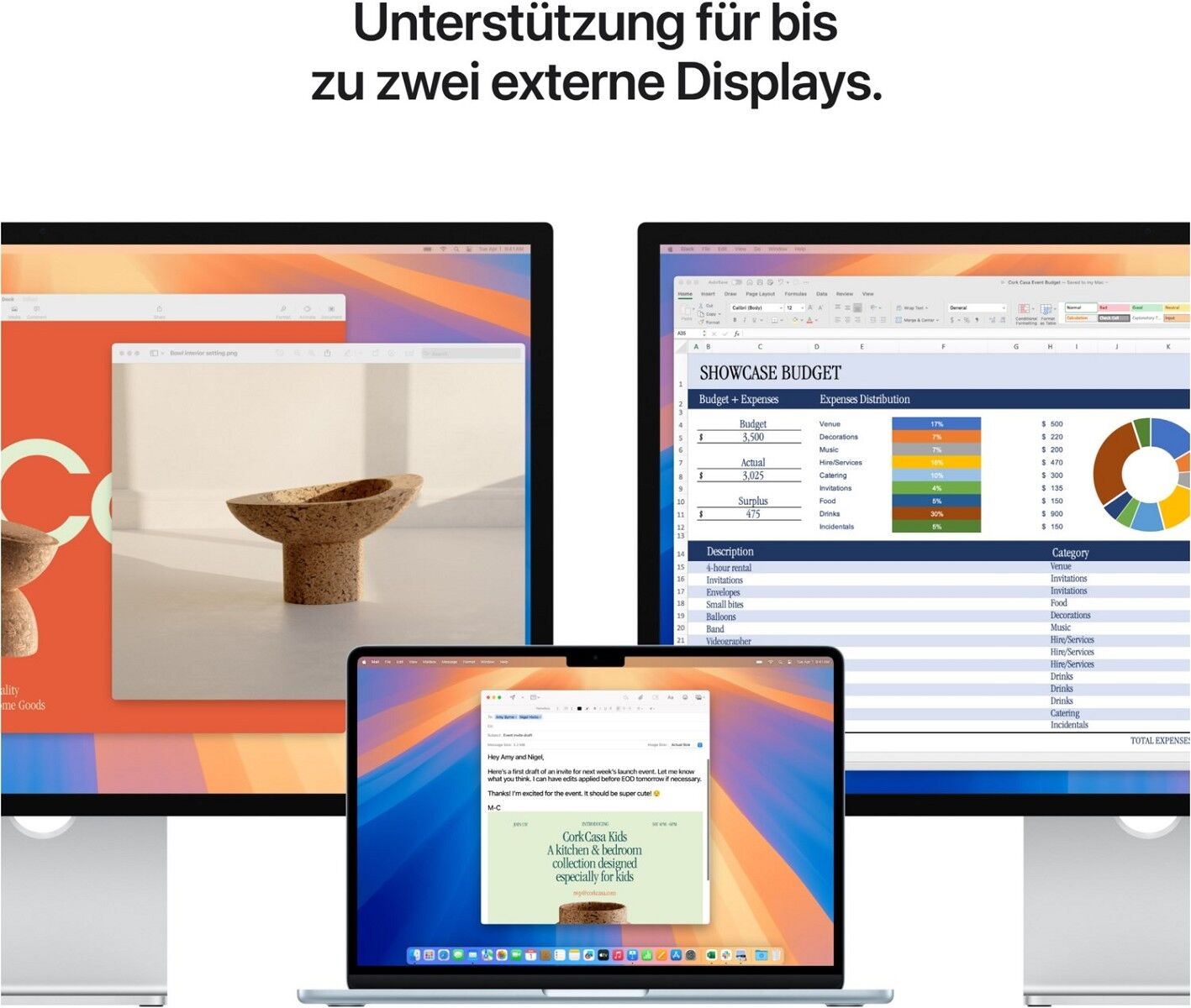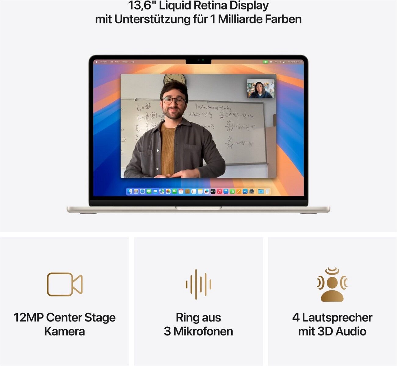 ³ Das Display des 13" MacBook Air hat oben gerundete Ecken. Als Standard-Rechteck gemessen hat das Display eine Diagonale von 13,6" (34,46 cm). Der tatsächlich sichtbare Displaybereich ist kleiner.