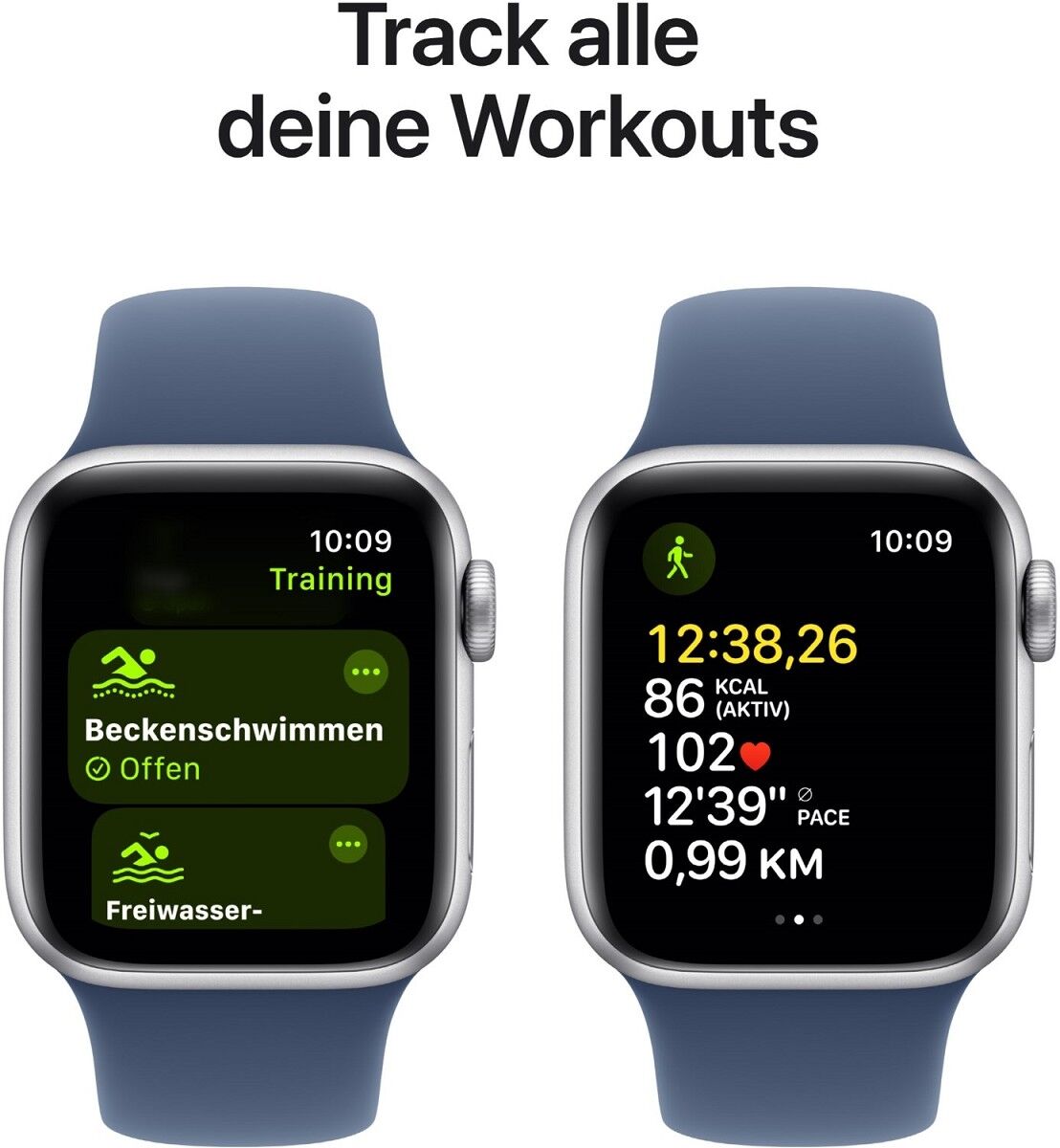 ⁸ Die Apple Watch SE ist wassergeschützt bis 50 Meter nach ISO Norm 22810:2010. Das bedeutet, sie ist für Aktivitäten in flachem Wasser wie Schwimmen in einem Pool oder im Meer geeignet. Die Apple Watch SE sollte nicht beim Sporttauchen, Wasserski oder bei anderen Wasseraktivitäten mit hohen Geschwindigkeiten oder in tieferem Wasser verwendet werden. Wasserschutz ist kein dauerhafter Zustand und kann im Laufe der Zeit abnehmen. Weitere Infos findest du unter support.apple.com/de-de/HT205000.