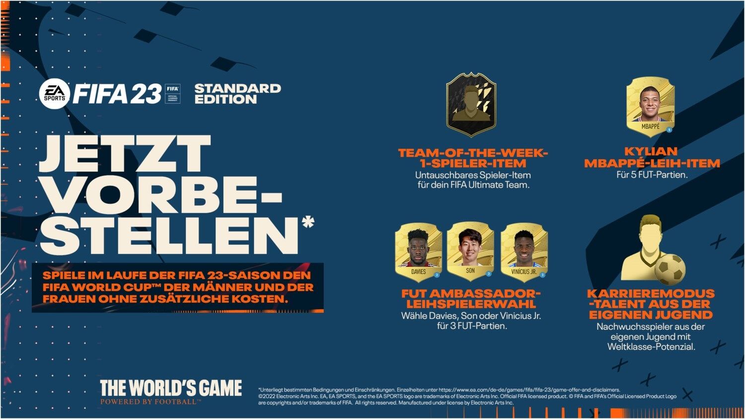 The World's Game: EA SPORTS™ FIFA 23 sorgt für noch realistischeren und noch intensiveren Fußball. Die Weiterentwicklungen der HyperMotion2-Technologie basieren auf der doppelten Menge an realem Motion-Capturing und ermöglichen in jeder einzelnen Partie mehr authentische Fußball-Animationen als je zuvor. Spiele im Rahmen der FIFA 23-Saison die größten Turniere der Fußballwelt. Erlebe den FIFA World Cup™ der Männer und der Frauen, spiele dank maßgeschneiderter HyperMotion2-Animationen erstmals mit Frauen-Vereinsmannschaften und freue dich auf Cross-Play-Features, die das Spiel mit Freundinnen und Freunden noch stärker erleichtern. In FIFA Ultimate Team™ erwartet dich mit den FUT Moments eine neue Variante für das Gameplay und den Aufbau deines Wunschteams und ein überarbeitetes Chemie-System. Und im Karrieremodus kannst du deine Fußballträume ausleben, deine Persönlichkeit als Spieler definieren und in die Rolle einiger der berühmtesten Fußballtrainer der Welt schlüpfen. In VOLTA FOOTBALL und Pro Clubs kannst du mit neuen Anpassungsoptionen und optimiertem Straßen- und Stadion-Gameplay noch mehr Persönlichkeit auf den Rasen bringen. Egal wie du spielst, genieße absolute Authentizität in FIFA 23 und erlebe The World's Game mit über 19.000 Spielern, 700+ Teams, 100+ Stadien und mehr als 30 Ligen, darunter die UEFA Champions League, die Premier League, die neue Barclays FA Women's Super League und die französische D1 Arkema.