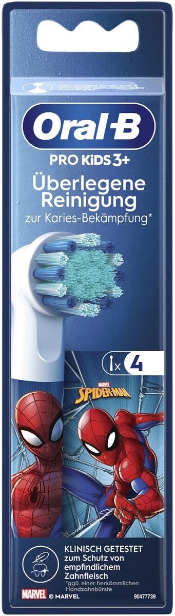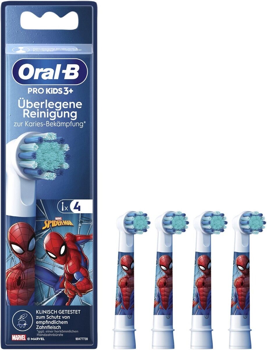 Die Oral-B Pro Kids Spiderman Ersatz-Aufsteckbürsten für elektrische Zahnbürsten wurden speziell für Kinder ab 3 Jahren entwickelt. Der kleine Bürstenkopf mit extra weichen Borsten passt perfekt in einen Kindermund und reinigt die Zähne und das Zahnfleisch besonders sanft und effektiv. Jede Aufsteckbürste ist mit Spiderman-Figuren bedruckt, die für noch mehr Spaß beim Zähneputzen sorgen. Kompatibel mit allen Oral-B Kids elektrischen Zahnbürsten.