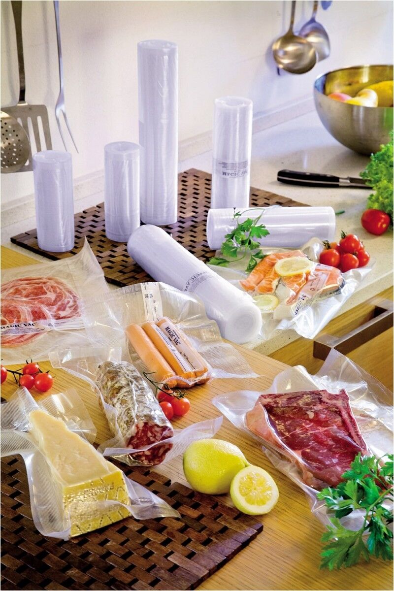 Die Verwendung von Original Rommelsbacher MagicVac® Folien garantiert eine einwandfreie und schnelle Vakuumierung mit den Rommelsbacher Vakuumiergeräten. Die patentierte 2-Schicht Qualität sowie die spezielle Riffelung sorgen für beste Vakuumier-Eigenschaften. In den Rollen lassen sich Lebensmittel platzsparend und sicher vor Gefrierbrand im Tiefkühler lagern und anschließend in der Mikrowelle erwärmen. Sie sind hitzebeständig bis 100°C, so dass darin Lebensmittel im heißen Wasserbad erhitzt werden können. Selbst für das immer populärer werdende Sous-Vide Garen (Vakuumgaren bei Niedrigtemperatur) sind diese speziellen Rollen bestens geeignet. Die robuste Qualität macht eine umweltfreundliche Mehrfachverwendung möglich: einfach gut ausspülen und immer wieder verwenden. Neben Lebensmitteln lassen sich in den Folien aber auch andere Dinge geschützt lagern: Vakuum schützt Schmuck vor dem Anlaufen, bewahrt empfindliche Dinge (z. B. Verbandsmaterial oder Camping-Vorräte) vor Feuchtigkeit und Schmutz. Bestes Material für optimale Vakuumier-Ergebnisse!